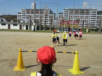 1年生は、自分たちで審判をしながら「ボールけりあそび」を楽しんでいます。