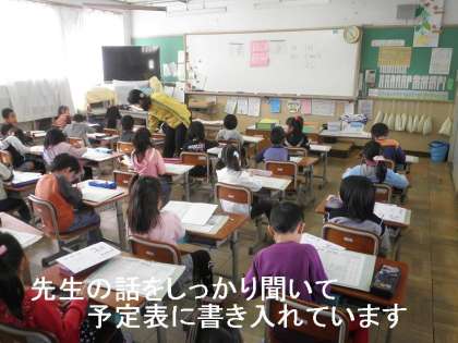 朝会の後,1年生の教室をのぞくと,みんなきちんと座り先生の話をしっかり聞いています。そして,先生が話されたことを予定表にメモっていました。