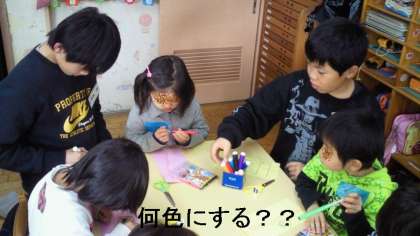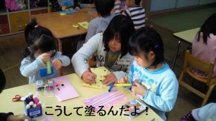 室内では,4歳児と凧つくりです。親切ていねいに教えています。言葉使いにも気をつかっています。