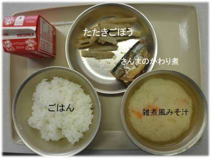 「ごはん」「雑煮(ぞうに)風みそ汁」「さんまのかわり煮」「たたきごぼう」