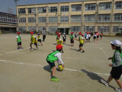 1年生の体育科、ころがしドッジボールは、子どもたちが審判をしてゲームを楽しんでいます。