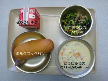 今日の献立は,豆乳のクリームシチュー・小松菜のソティ・ミルクコッペパン・牛乳です。