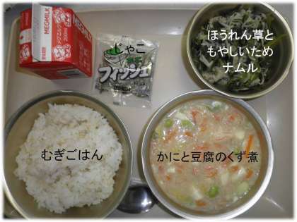 「むぎごはん」「かにと豆腐のくず煮」「ほうれん草ともやしの炒めナムル」「じゃこ」でした。