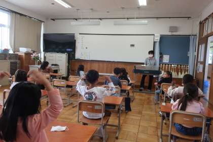 音楽科の学習です。今日は、みんなが知っている歌「大きなくりの木の下で」を大合唱。