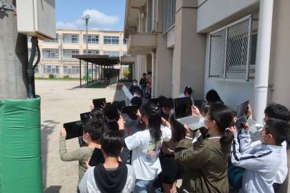 理科の学習です。今日は、雲の量や色、形に着目して、天気と雲の関係について話し合いました。GIGA端末を活用して、雲の様子を動画で撮影した後、天気がどのように変化していくのか予想を立てていました。
