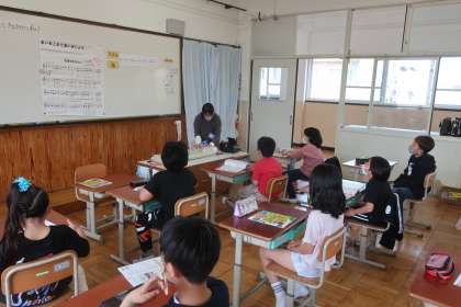 音楽科の学習です。曲は『花束をあなたに』。歌詞から感じることをクラスで話し合い、リズムや拍にも気をつけながら思いをこめて歌いました。