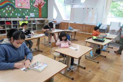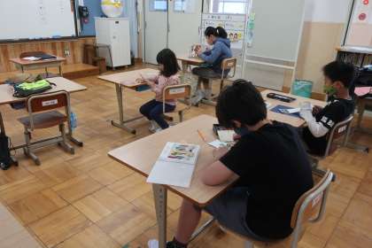 自分の写真が貼られたカードに、名前と好きな絵を書きました。一文字ずつていねいに文字を書き、それぞれの個性があふれた名前カードになっていました。