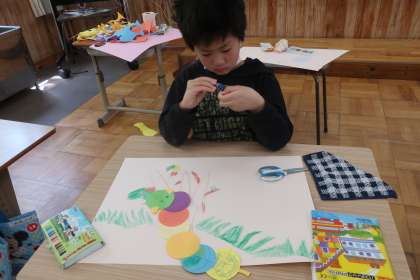 図画工作科の学習です。先日作成した「あおむし」を画用紙に貼り付けました。
