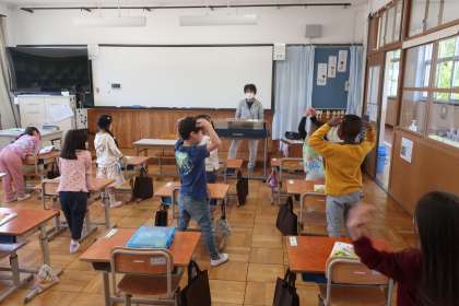 音楽科の学習です。今日は、音を聞きリズムをとりながら、みんなで体を動かしました。