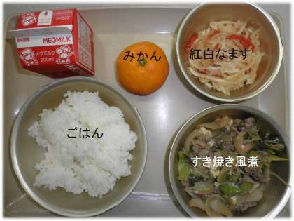 「ごはん」「すき焼き風煮」「紅白なます」「みかん」です。