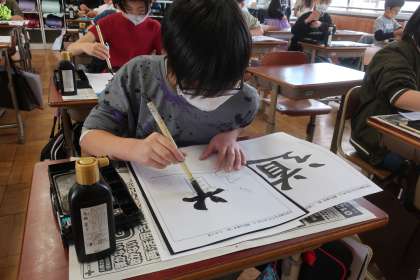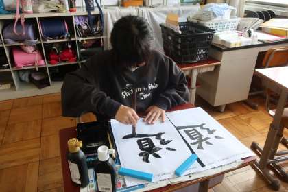 『道』のポイントは「しんにょう」の筆遣い。姿勢よく、そしてはらう方向に気を付けながらじっくりと書いていました。