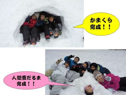 いろいろな形のかまくらを作ったり,友だちを雪の中に入れて人間雪だるまを作ったりしています。