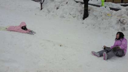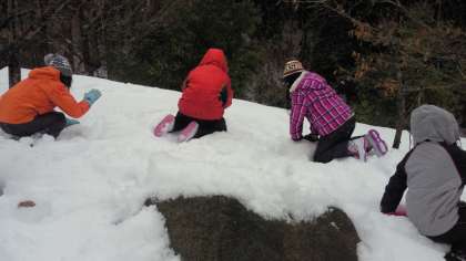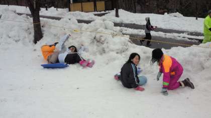 気温は1度で,雨の中の活動にもかかわらず,子どもたちは『花背山の家』での雪山チャレンジ体験活動をどんどん続けています。