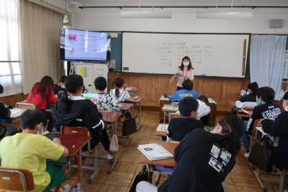 音楽科の学習です。今日は、木管楽器や金管楽器、打楽器などオーケストラで用いられる楽器の種類について学習しました。実際に楽器の音を聞くことで、同じ弦楽器でも高音・低音を発する種類の楽器があることに気付いたようです。