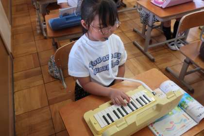 今日は、子どもたちの大好きな鍵盤ハーモニカで「かえるのがっしょう」のコンサート!指づかいやはやさ、リズムに気をつけながら、軽快に演奏する子どもたちでした。