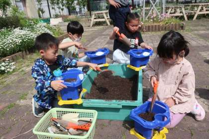 こぼさないように鉢いっぱいに土を入れて、大切にたねを植えていました。