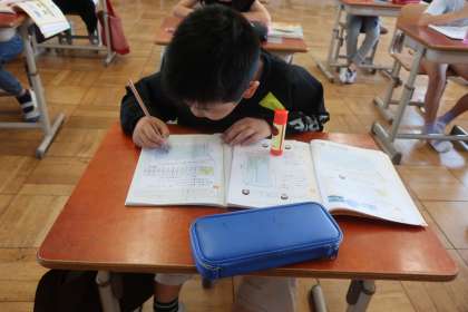 算数科「折れ線グラフ」の学習も最終です。今日は.2つのデータが一つに表されたグラフの読み方について考えました。縦軸や横軸、表題や1めもりが表す数値など、今までの学習を関連させながらじっくり考えていました。