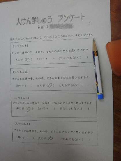 最初に子どもたちにアンケートを取りました。そしてその結果から男女平等についてみんなで意見を交換しました。