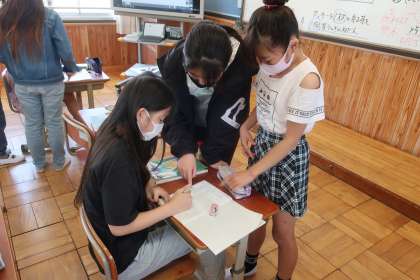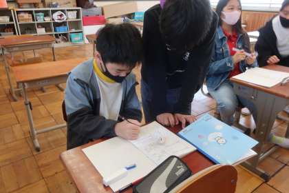 算数科の学習です。XやYを使った式が何を表しているのか考えました。中学校の数学につながる大事な単元の一つ。なかなか言葉で説明できず頭を抱える6年生でしたが、子どもたち同士が教え合い、学び合うことで理解につながったようです。