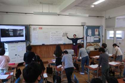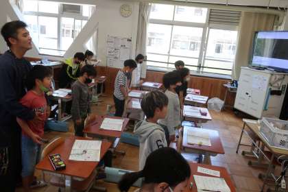 まず、声が高くさわやかな感じのするものと、声が低くおだやかな感じのする2種類の曲を静聴。曲のイメージに合うものはどちらか考え、工夫して歌うことができました。