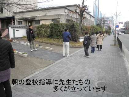 毎朝早くから,横断歩道などには,子ども見まもり隊の方,そして,正門には管理用務員さんや先生たちが複数名で立って登校指導しています。