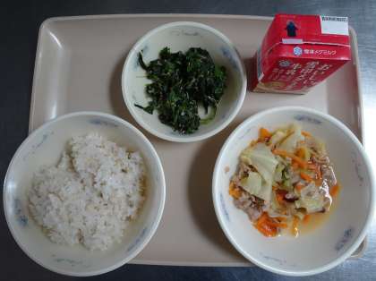 今日の給食は、「麦ごはん」「牛乳」「豚肉とキャベツのみそいため」「ほうれん草とじゃこのいためもの」でした。