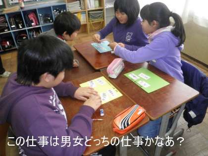 人権学習の中の「男女平等教育」の授業でした。いろいろな仕事を取り上げて,固定的な観念で,男の仕事?女の仕事?と分けられないことを,子どもたちの話し合いの中から理解し学習しました。