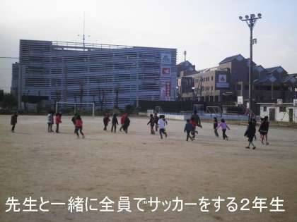 中間休みの運動場は2年・3年生が独占して,サッカーをしています。今日は4年〜6年生が音楽鑑賞でいないので,低学年の天下です。