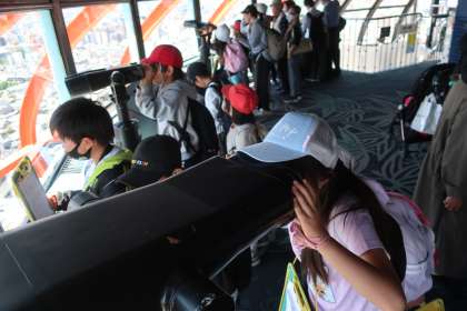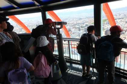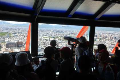 社会見学の最後は、地下鉄に乗って京都タワーへ。京都市内を一望できる展望室に到着するなり、これまで地図上でしか確認しなかった『京都御所』や『平安神宮』、『大文字山』『京都駅』等々、遠近関係なく望遠鏡でじっくり確認していました。