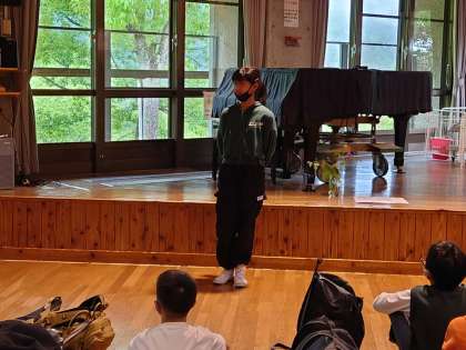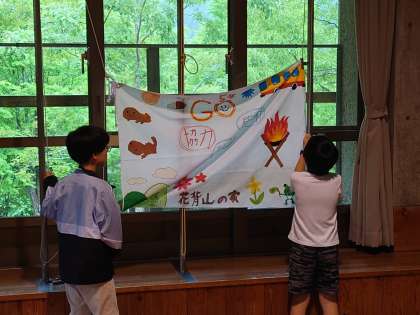 自分たちで作り上げた旗を掲揚し、所員さんの話をしっかり聞きました。