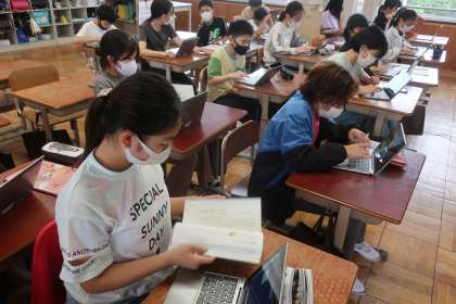 国語科の学習です。今日はこれまでの学習をもとに、筆者の考え方に対する自分の考えを交流しました。