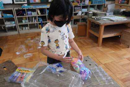 図画工作科の学習です。光を通すペットボトルの材質を利用して、オリジナルの生き物たちを作り出しました。