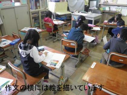 それぞれ,がんばっていることを一生懸命書いていました。そして,作文の横に自分のがんばっている姿を絵に描いていました。