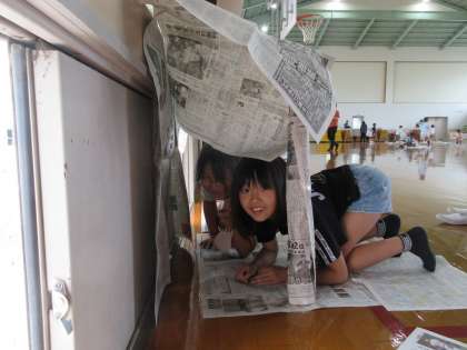 新聞紙を、ちぎったり、つなげたり、はりつけたり。