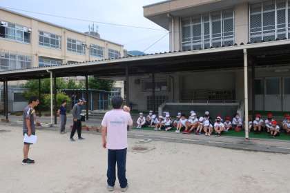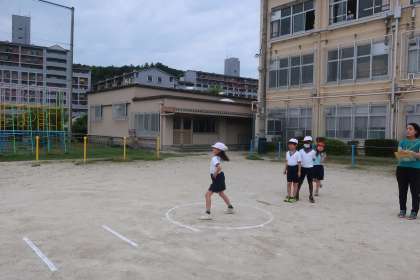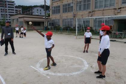 1年生は、たてわりグループの6年生から親切に投げ方を教わっていました。