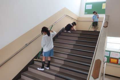 今日から、スマイルそうじがスタートです。たてわりグループで、各そうじ分担場所に分かれてのそうじです。6年生が声をかけ、グループで協力し合いながら集中して取り組んでいました。