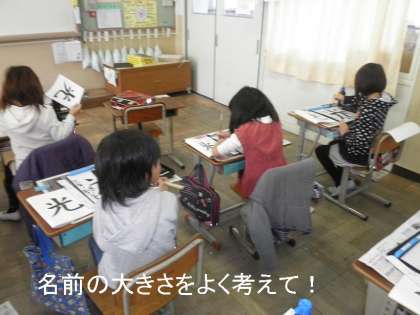 習字の時間に,「光」という字を書きました。3年生の習字(毛筆)は一字の漢字が中心です。でも,画数が増えてきて,なかなか難しくなってきています。