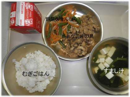 「むぎごはん」「あなご丼の具」「野菜のきんぴら」「すまし汁」