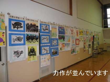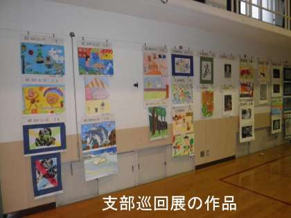 明後日から始まる校内作品展に向けての準備がはじまっています。その中で支部10校の子どもたちの作品展(支部巡回展)が同時にありますので,体育館の壁面に掲示されました。