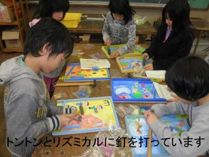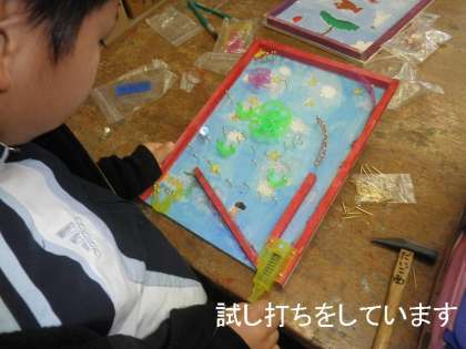 のぞいてみると,3年生の子どもたちが楽しそうに「コリントゲーム」のくぎ打ちをしていました。