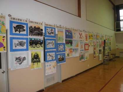 本日より,醍醐10校の支部巡回展が本校ではじまっています。10校のお友だちの力作が体育館に掲示されています。