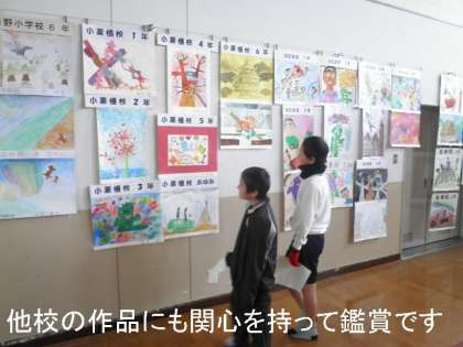 自分たち6年生の作品と,他校の6年生の作品(支部巡回展)と比較したり,下学年の作品を批評したりして,友だち同士で意見(感想)を交換していました。