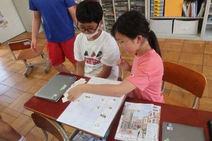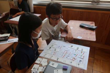 これまで習った教科の言い方を参考に、グループになって『好きな時間割』を作成しました。