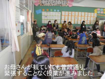 楽しい雰囲気で授業が進み,その後,学級懇談会が開かれました。また,体育館では,作品展を鑑賞される保護者の方も多かったです。
