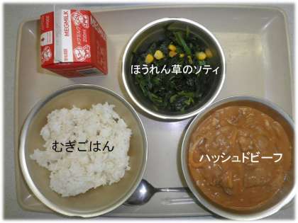 「むぎごはん」「ハッシュドビーフ」「ほうれん草のソティ」