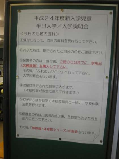 本日2月15日(水)14時30分(受付14時〜)から,24年度入学児童の「入学説明会」(保護者対象)と「半日入学」(児童対象)を実施します。