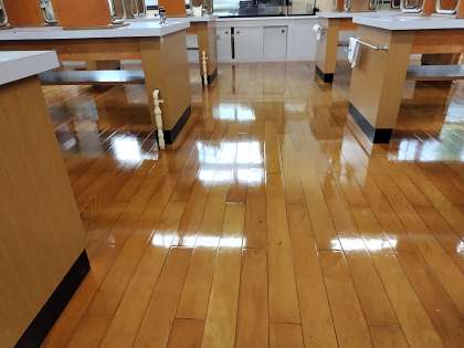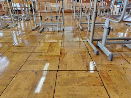その予算で、今年度は6−1と理科室の床塗装を、また校舎内の階段及び下駄箱付近の床をきれいにさせていただきました。