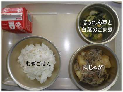 「むぎごはん」「肉じゃが」「ほうれん草と白菜のごま煮」