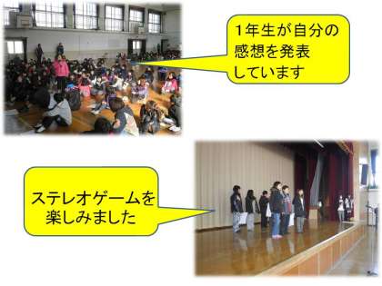 恒例の先生の1分間スピーチは,今回は二人で1年生と6年生の担任の先生でした。
