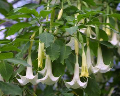 中庭に「エンジェルトランペット」という低木があります。この植物は不思議なことがいっぱいあります。この冬に枝を切って水につけておいたら,白い根が何百本も出てきました。そしてそれを春に花壇に植えたら・・・!